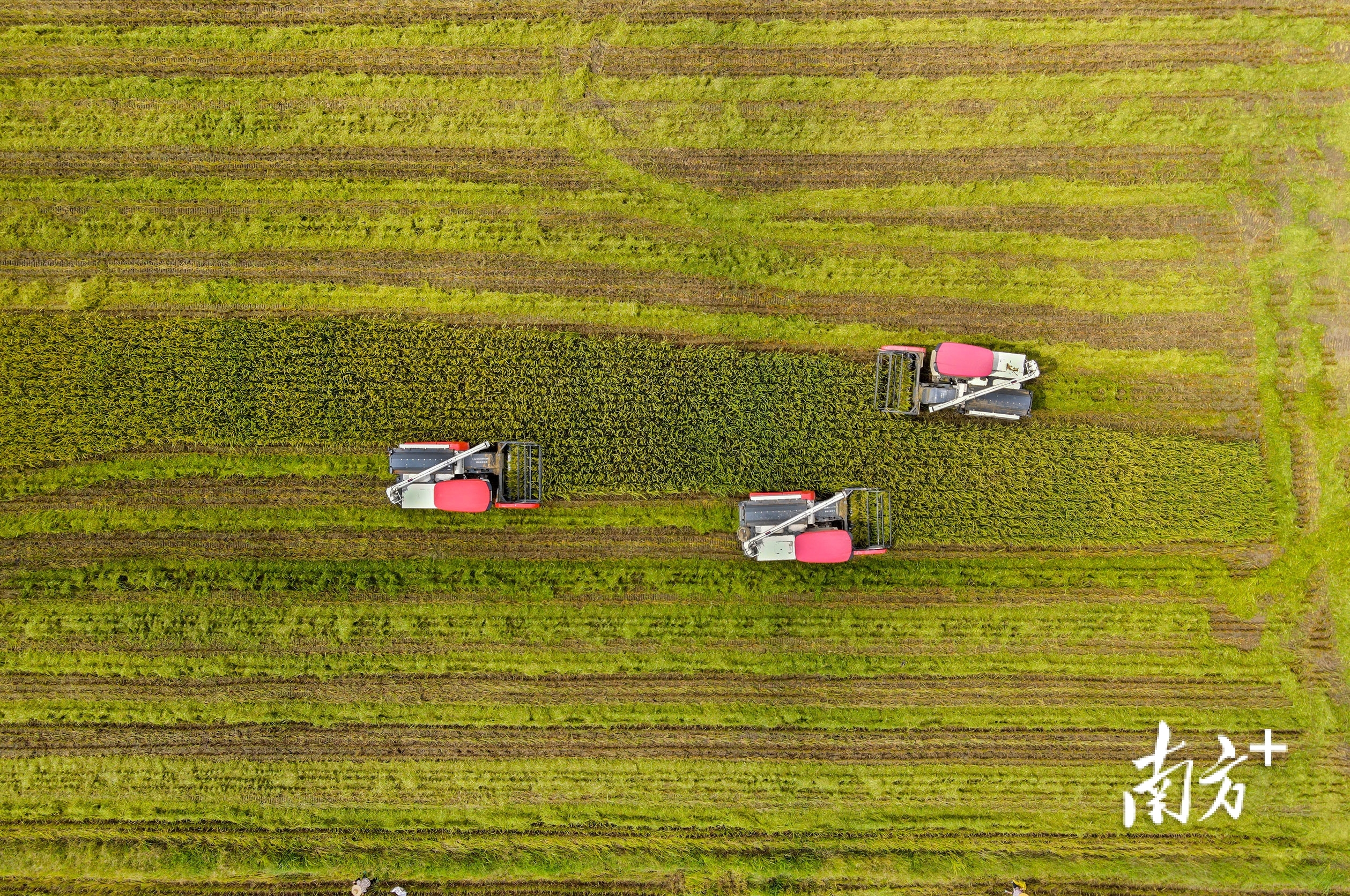 7月19日,广州从化区生态优质丝苗米产业园内的稻田里收割机械在稻田来回穿梭,一派丰收景象。南方日报记者 符超军 摄